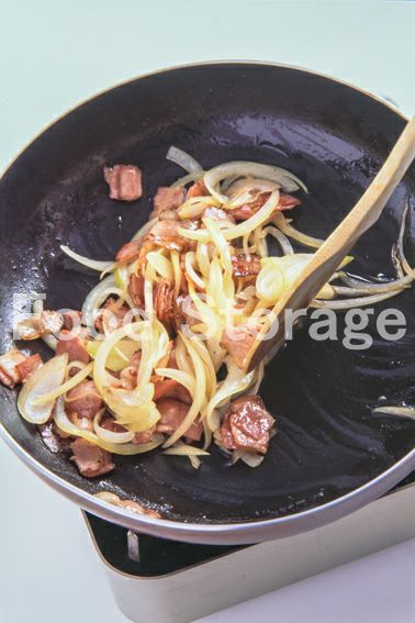 フライパンにバターを溶かし、ベーコンを表面がカリカリになるまで炒め、玉ねぎを加えて透明になるまで炒め合わせる。 |