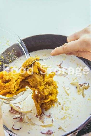 5に生クリーム、4でくりぬいたかぼちゃ(200g)を加えて混ぜながら煮詰める。 |