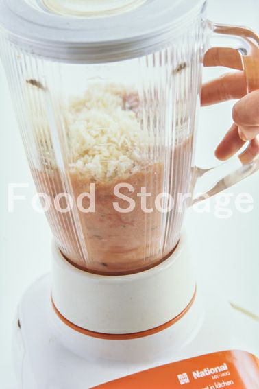 ミキサーに刻んだ野菜類、にんにく、トマトジュース、生パン粉、オリーブ油を入れてまわし、冷蔵庫で冷やしておく。 |