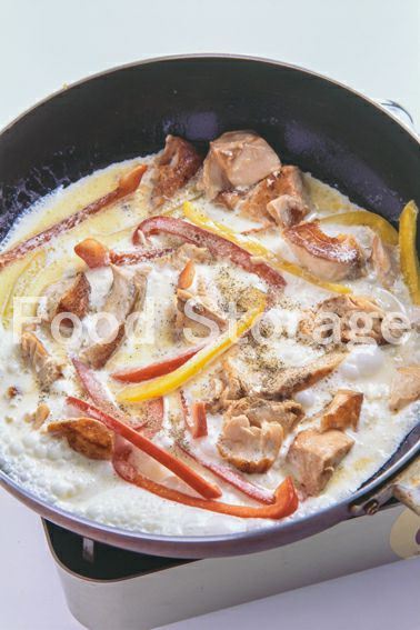 鮭は塩、こしょうをふり、バター(分量外)を溶かしたフライパンでこんがりと焼き、粗めにほぐしておく。鍋にパスタをゆでる湯を沸かし始める。パプリカはそれぞれ細切りにする。にんにくはみじん切りにする。 |