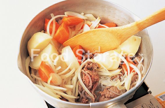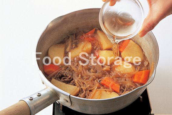 水 砂糖 酒 しょうゆ みりん 牛切り落とし肉 じゃがいも にんじん 玉ねぎ しらたき さやえんどう サラダ油