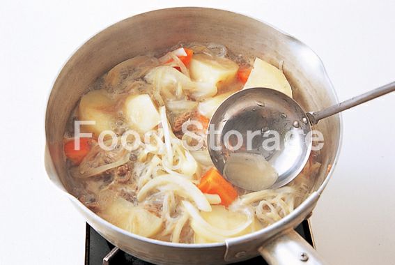 じゃがいもとにんじん、しらたきを加えて炒め合わせ、全体に油がなじんだら、分量の水を加え、強火で煮る。沸騰したら、砂糖、酒を加え、煮立ったら中火にし、アクを取る。 |