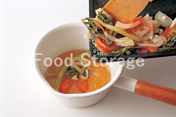 6の野菜がのっている天板にブイヨンを加え、鍋に野菜ごと移し入れる。 |