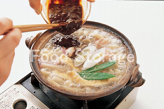 | 赤みそベースのだし汁でうどんをぐつぐつ煮込んだ名古屋の味。煮詰まりすぎたら、だし汁を加えながら調整を。 |