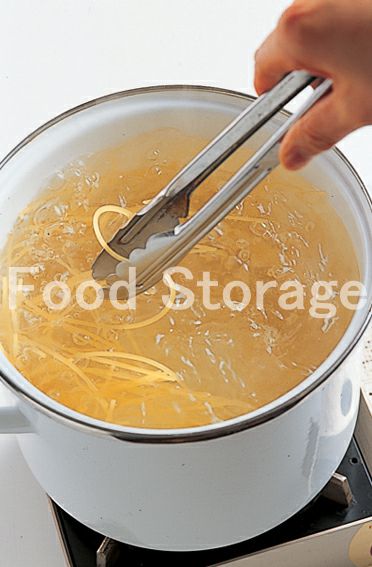 鍋にたっぷりの湯を沸かし、塩大さじ2を加えてパスタをゆで始める。 |
