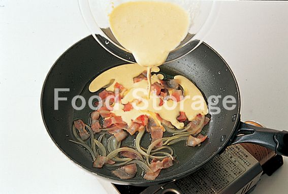 ベーコンは1.5cm幅に、玉ねぎは薄切りにする。 |