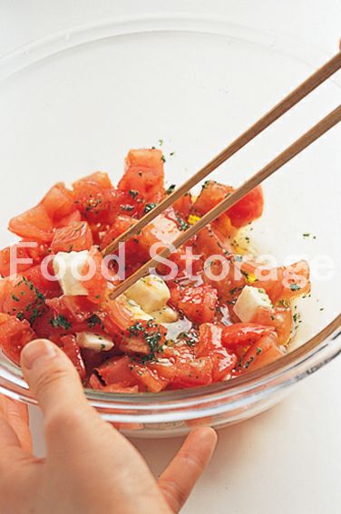 トマトは湯むきし種を取り除き、1.5cm角に切る。モッツァレラチーズも1.5cm角に切る。パセリはみじん切り、にんにくはすりおろす。 |