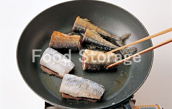 さんまの水けを拭いて小麦粉をまぶし、フライパンにオリーブ油を熱して両面を焼く。しめじも一緒に炒める。 |