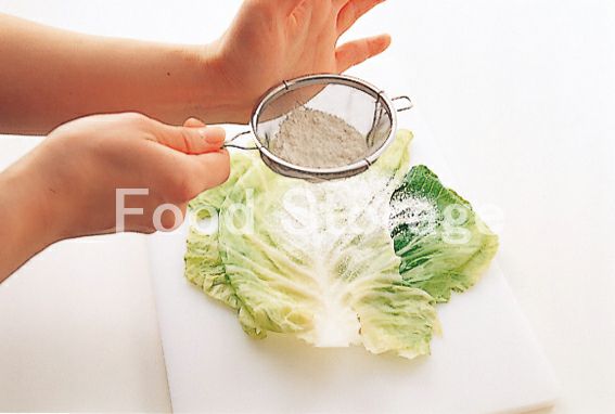 1のキャベツを広げて茶こしで小麦粉をふり、2を手前にのせて巻き、楊枝で留める。 |