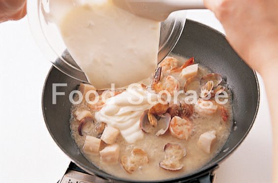 あさりの口が開いたらホワイトソースを加えて混ぜ、塩、こしょうで味を調える。 |
