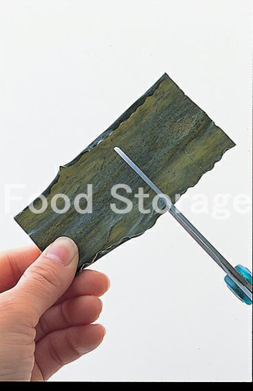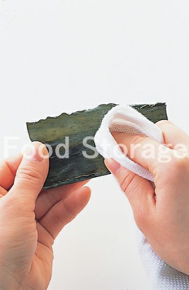 だし昆布は乾いたふきんで表面の汚れやごみを軽く拭き取る。白い粉はうまみ成分なので拭き取らないように。 |