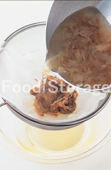 ぬれぶきんかぬらしたペーパータオルを敷いたこし器でこす。残った削り節は雑味が出るので絞らないこと。 |