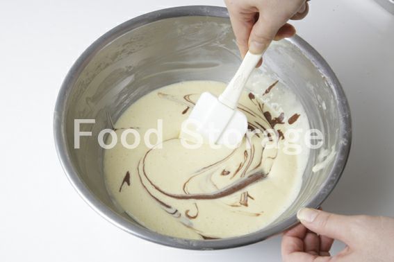 1の残りに2のココア生地を3ヶ所に分けて加え、ゴムべらで縦、横にさっくりと2回ずつ切り込みを入れるようにしてマーブルにする。