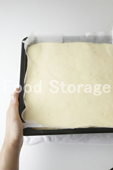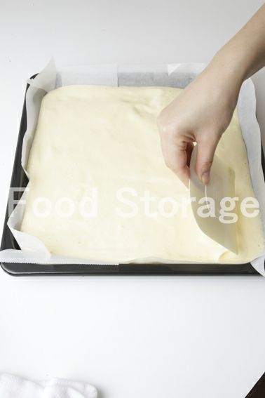 オーブンシートの側面部分を生地からはずしてひっくり返し、底面部分もゆっくりはがす。はがしたオーブンシートをのせて、そのまま生地の上にのせてもう一度表面に生地を返す。 |