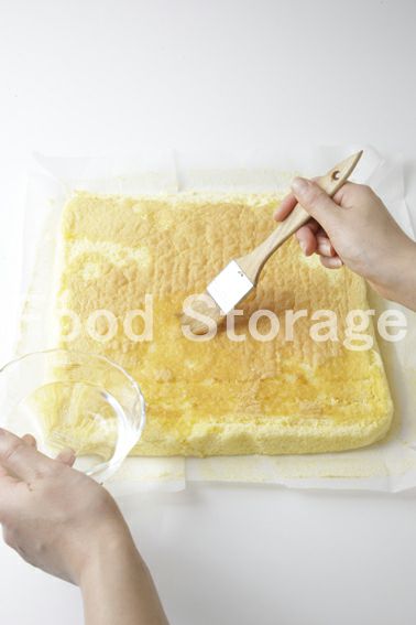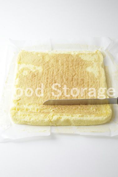 ロールケーキ生地は焼き色がついた面を上にして置き、巻き終わりになるほうの端を1cmくらい斜めに切り落とし、上面の手前に3本ほど、ケーキナイフで軽く筋目を入れる。 |