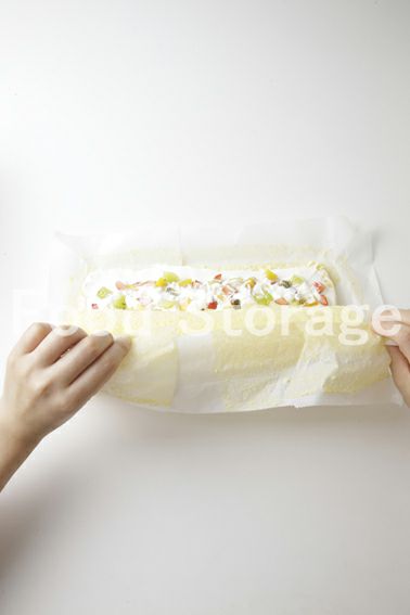 中心に1のクリームをのせ、パレットナイフで均一に塗り広げ、フルーツを彩りよく向こう4cmほど残してのせる(巻いていくうちに、押されていくため)。手前からオーブンシートごと持ち上げる。