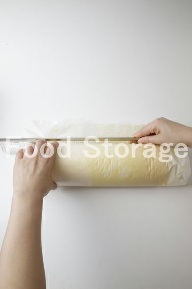 オーブンシートの上から左手でケーキを押さえ、定規でオーブンシートをロールの下に押し込み、しっかりと押さえて形を整える。冷蔵庫で30分以上冷やし、オーブンシートをはずす。 |