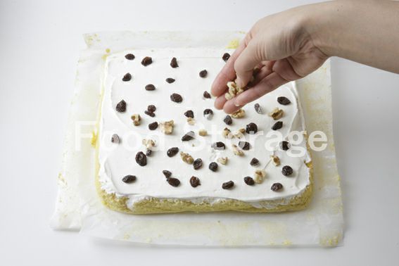 【フルーツロールケーキ】の巻き方を参照して、2のシロップ、3のクリームを全体に塗り広げ、ラム酒漬けレーズン、刻んだくるみを散らして、オーブンシートごと手前から巻いていき、巻き終わりを下にして冷蔵庫で30分以上冷やす。