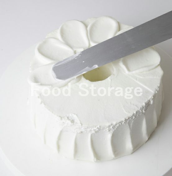 1の紅茶のシフォンケーキを回転台にのせ、上面に2のホイップクリームをたっぷりのせ、パレットナイフで平らにならし、余分なクリームを側面にたらして、上面、側面、内側の順に表面を塗って整える。