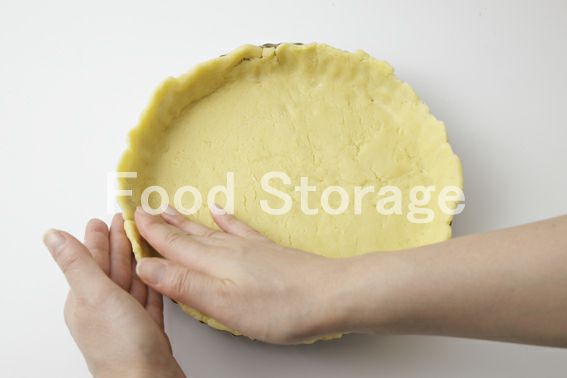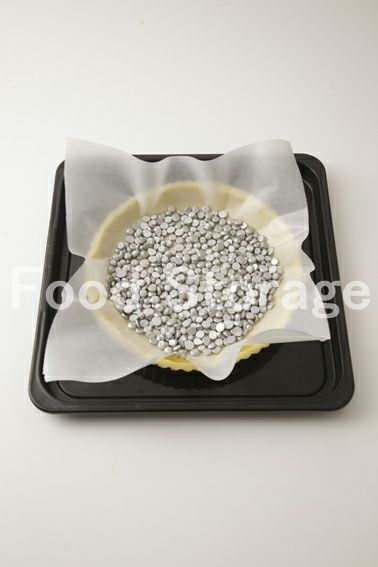 生地の内側にオーブンシートを敷き、その上から重し(専用のタルトストーン、又は米か小豆1カップ)をのせ、200℃に予熱したオーブンで15分ほど焼く。