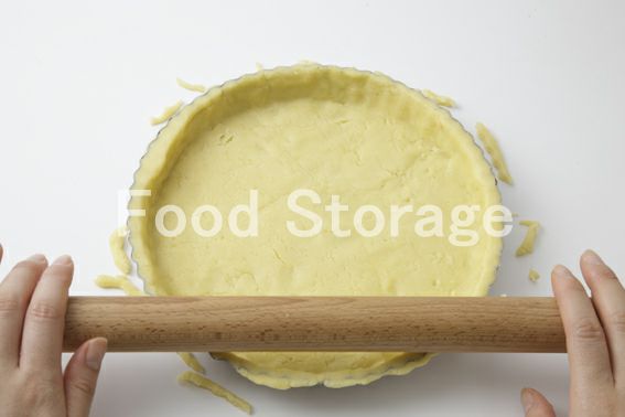 めん棒を型の上で転がし、型の縁にはみ出した余分な生地を切り落とす。※ 余った生地は、小さく焼けば、クッキーやミニタルトも作れる。