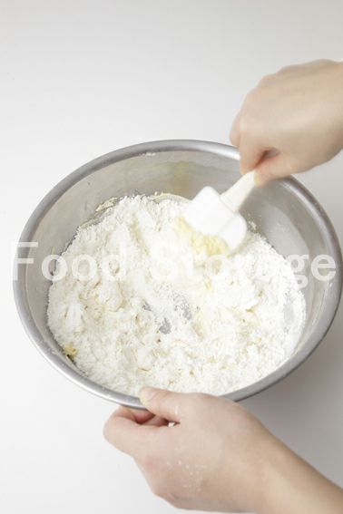 3に薄力粉を加え、ゴムベラでさっくりと混ぜ合わせて、そぼろ状になったらひとまとめにする。ここで練りすぎるとサクサクの生地に仕上がらないので要注意。