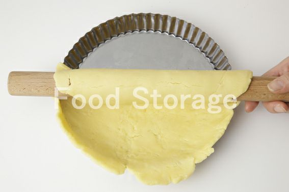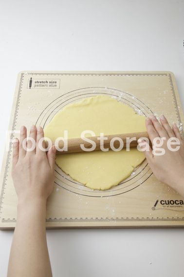 めん台に打ち粉用の強力粉適量(分量外)をふり、ラップをはずした生地をのせ、同様に打ち粉をふっためん棒でタルト型よりも一回り大きく、3mm厚さになるようにのばす。