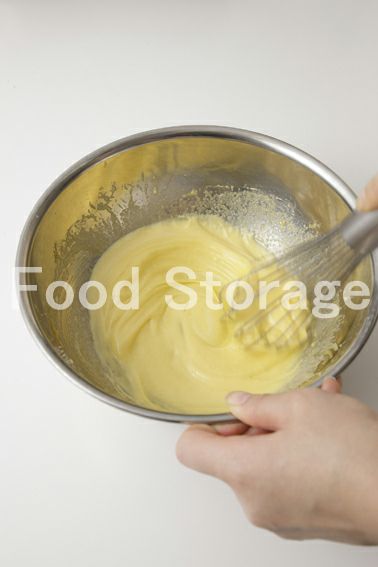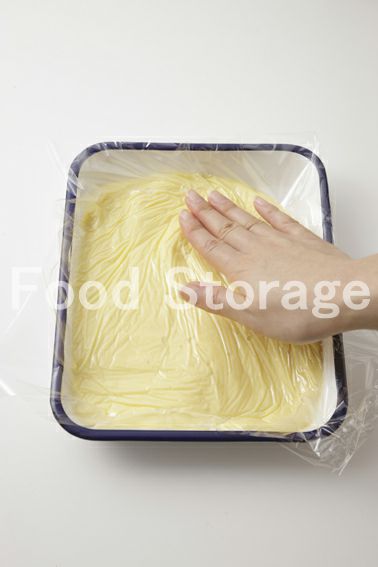 カスタードクリームをバットに流し入れて平らにならし、ラップをクリームの表面にぴったりとはりつけるように覆う。底を氷水で急冷する。すぐに使わない場合は冷蔵庫へ。