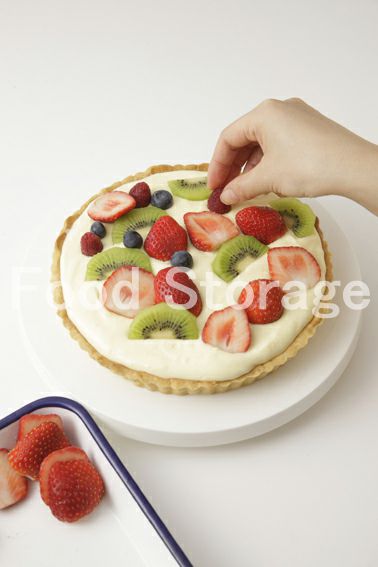 切っておいたフルーツを、クリームの上に彩りよくのせて並べる。