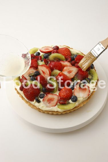 ゼリー液を氷水で冷やしながら、とろみが出るまでかき混ぜる。はけで10のフルーツの上からつやよく塗っていく。ミントの葉を飾る。 |
