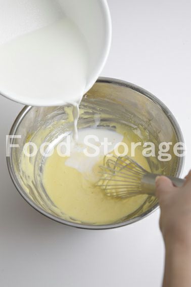 牛乳を鍋に入れて沸騰直前まで温めたら、2のボウルに少しずつ注ぎ入れて手早く混ぜ合わせる。