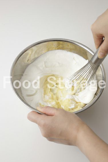 ボウルにBを入れ、底を氷水にあてながらハンドミキサーで8分立てに泡立てる。ボウルに移したカスタードクリームに少しずつ加えて混ぜ合せる。