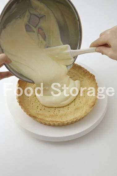 焼いて冷ましたタルト皿に8のクリームを流し入れ、隅々まで行き渡らせたら、平らにならす。