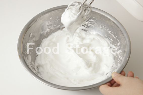 別のボウルに卵白を入れて軽くハンドミキサーで混ぜたら、残りのグラニュー糖(40g)を、数回に分けて加え、ぴんと角が立つまで泡立てる。