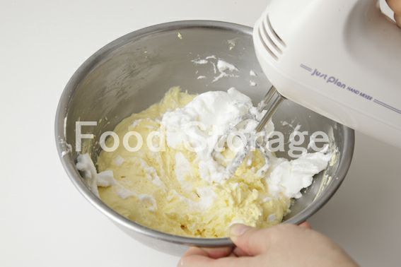 グラニュー糖の半量(40g)を加えて、ハンドミキサーで白っぽくなるまで混ぜ、卵黄を1個ずつ加えながら、その都度よく混ぜる。