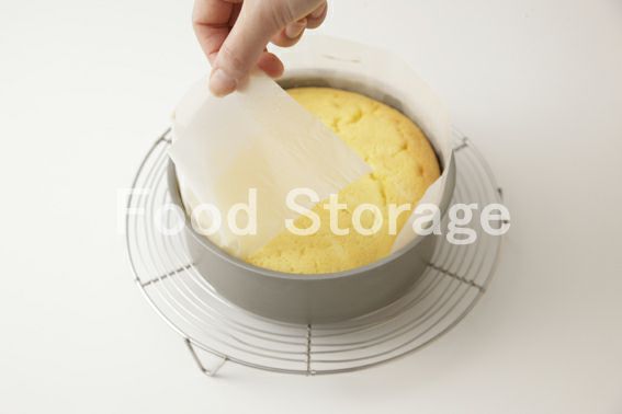 焼き上がったら、ケーキクーラーにのせ、側面の型紙を抜き、粗熱が取れたら型ごと冷蔵庫で1時間ほど冷やす。Bを煮詰め、上面にたっぷりと塗る。 |