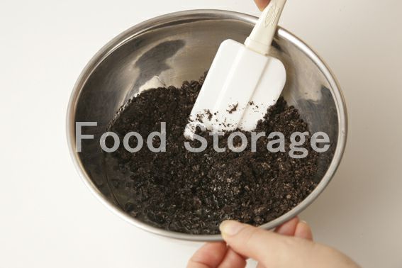 ボウルに砕いたオレオクッキーを入れ、溶かしバターを加えてひとまとまりになるくらいによく混ぜ合わせる。