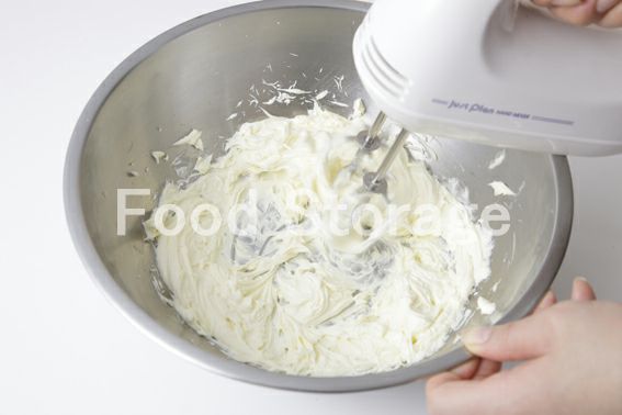ボウルにクリームチーズを入れ、ハンドミキサーの高速でなめらかなクリーム状になるまで混ぜる。
