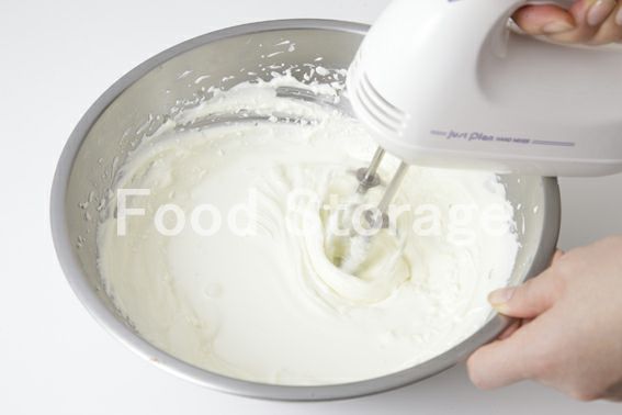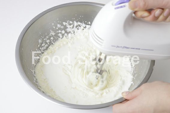 生クリームを半量(100ml)加え、ハンドミキサーの低速でよく混ぜ合わせる。