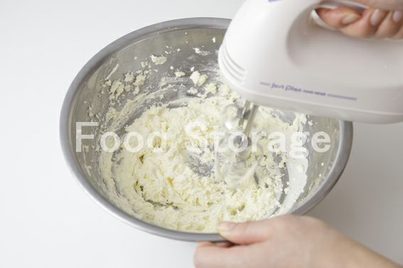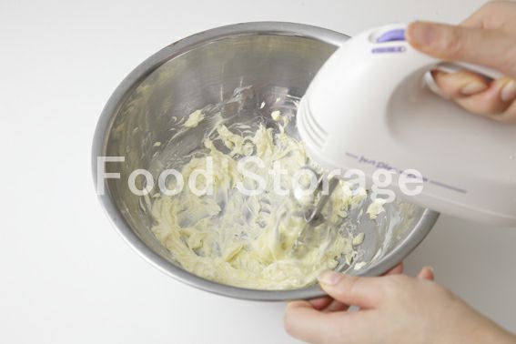 基本のマフィンを作る。ボウルにバターを入れ、ハンドミキサーの高速でなめらかなクリーム状になるまで混ぜる。