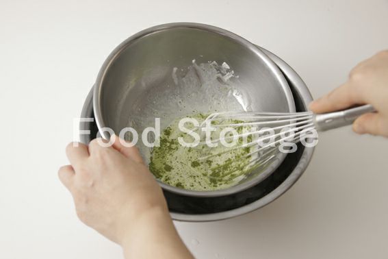 生クリームをボウルに3等分して入れ、すべてにグラニュー糖を小さじ1ずつと、ひとつには水溶き食紅、もうひとつには抹茶を加え、それぞれ氷水で冷やしながら泡立て器で8分立てにする。