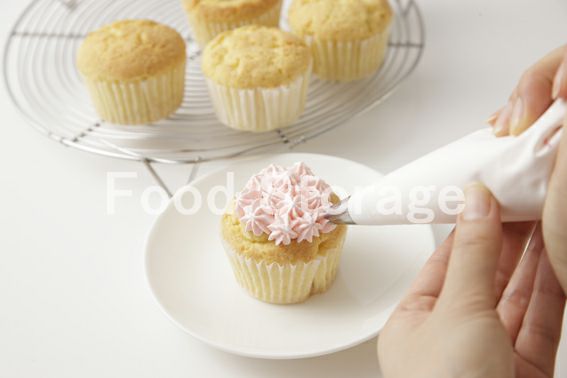7が焼き上がったら、型からはずしてケーキクーラーにのせて冷まし、8のクリームを好みの口金をつけた絞り出し袋に入れて絞り、アラザンなどの好みの砂糖菓子でトッピングする。 |