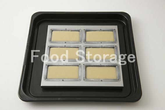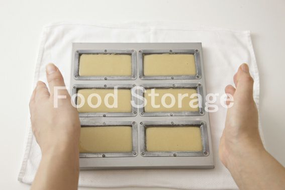 準備した型に生地の半量を型の9分めまで流し入れ、ぬれ布きんを敷いた台の上に軽く落とし、空気を抜く。