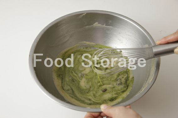 残り半分の生地には、抹茶を茶こしでふるい入れ、泡立て器で混ぜ、甘納豆を加えて6同様に型に流し入れて空気を抜く。