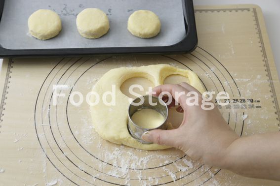 6の生地を打ち粉をした台にのせ、打ち粉をふった丸型で、9〜10個抜く。抜けなくなったら再び生地をまとめ、2.5cm厚さにのばして抜く。