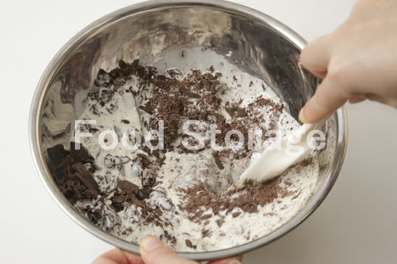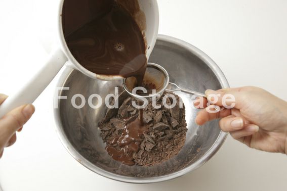 4に生クリームを加え、沸騰直前で火からおろし、刻んでおいたチョコを入れたボウルに茶こしでこしながら注ぎ、ゴムベラで混ぜる。 |