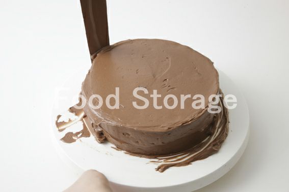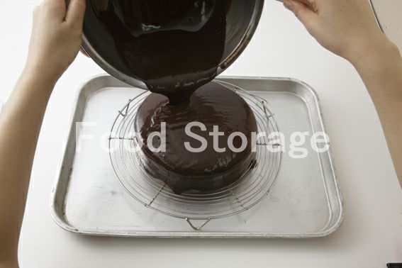 3のケーキをバットにのせたケーキクーラーに移し、6を全体に回しかけて均等に回るようにし、台に打ち付けて表面をならしたら冷蔵庫で冷やす。 |