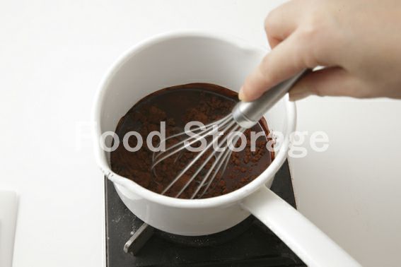 コーティングチョコを作る。鍋にDを入れて火にかけ、グラニュー糖が溶けたらココアパウダーを加えて泡立て器で素早く混ぜ合わせる。 |