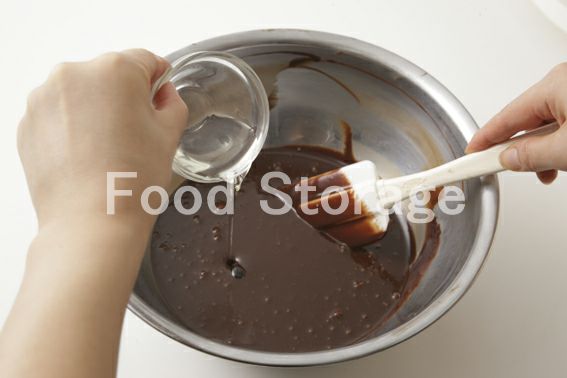 ガナッシュクリームを作る。生クリームを沸騰直前まで温めたら、刻んだチョコレートを入れたボウルに加え、手早くゴムベラで混ぜて完全に溶かす。 |