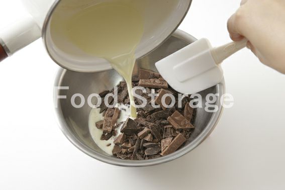小鍋にAを入れて火にかけ、沸騰直前で火からおろし、ボウルに入れたチョコレートに注いで混ぜ合わせる。, |